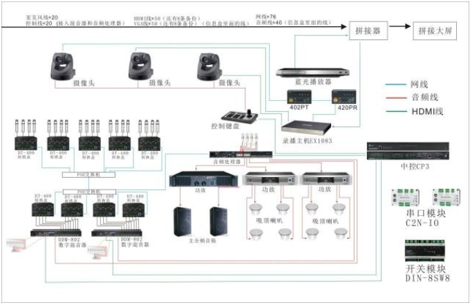 特別是在軍事機密之地,嚴肅、謹慎、高度戒備,在其會議室設備選擇上,除了要考慮到以上問題,還要求性能穩定,高效快捷,保密性強。經過多次篩選,軍區選用了DANTE智慧會議分布式解決方案:音頻部分用了CLOCKAUDIO的界面麥克風、名舞臺科技德捷品牌的DANTE網絡音頻轉換盒(DT-400 )、8路數字自動混音器、思美處理器、銳豐百靈達音箱,視頻部分用了哲聞科技柏邇品牌的網絡傳輸器(TP-402P HDBast),音視頻相結合,共同搭建了一個安全、高效、兼容傳統與DANTE、易于擴展的新型會議系統。