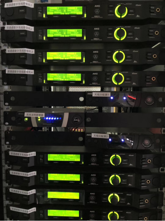 演藝廳舞臺左右兩側吊掛了各6只EV8寸線陣列覆蓋觀眾席,M15全頻音箱做下拉聲像揚聲器,B30超低音在舞臺下的預留孔洞中,臺唇位置設置了4只緊湊型的C5同軸揚聲器覆蓋前三排觀眾,4M12多功能揚聲器作為舞臺流動返送,全部的音箱都由系統功率放大器PLM12K44驅動,PLM12K44是一款4通道可遠程監控的DSP功率放大器,內置EV的揚聲器預設,便于使用者對揚聲器進行操控管理。演藝廳的擴聲系統還使用了16個通道的AKG DMS800數字無線系統。