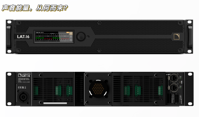那么,聲音的能量從哪里來(lái)呢?去年,L-Acoustics重新討論了功放的設(shè)計(jì)(LA7.16i),將功放與實(shí)際應(yīng)用聯(lián)系起來(lái)。L2和L2D共有20個(gè)驅(qū)動(dòng)器,8個(gè)3英寸的高音單元,8個(gè)10英寸低音單元,每一對(duì)低音單元共用1通道DSP和功放;另外還有4個(gè)用于心形的單元單獨(dú)處理和放大。所以,驅(qū)動(dòng)單只L2或L2D,我們需要16通道的高功率功放和16個(gè)最先進(jìn)的DSP通道。