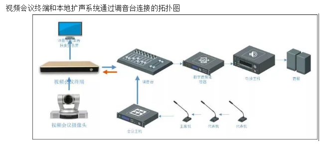 在連接視頻會議和本地話筒的時候,要把視頻會議終端的音頻輸出口連接到調音臺上去。然后本地話筒的信號經過調音臺后,通過編組輸出到編組接口,然后再把調音臺的編組輸出,連接到視頻會議終端的音頻輸入接口。或者有時候為了消除回聲,要把話筒的編組輸出到數字音頻處理器,然后從音頻處理器再連接到視頻會議終端的音頻輸入接口。