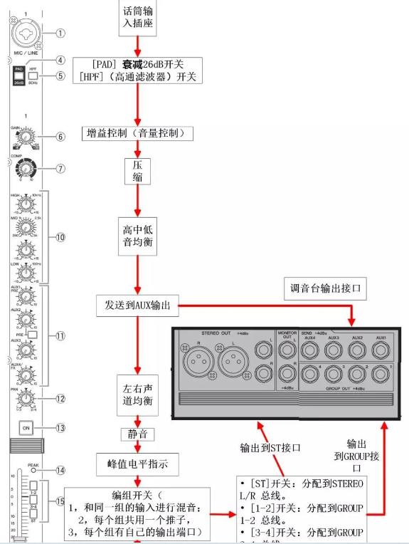 4.PEAK:峰值指示燈:Peak 燈亮時,警告使用者輸入信道內的訊號過強。發現 Peak 燈亮時,并且任由這種情況持續的話,調音臺會啟動自我保護功能,切斷音源輸出。