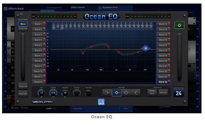 不僅如此,HD96-24還有著諸多強大且便捷的功能,在處理現場音頻時大顯身手。例如,使用了AUTOMIX自動混音來管理話筒音量;使用PIE擴展器,能對話筒聲音信號進行有效的降噪;還有使用內置Lake處理器強大EQ處理算法的Ocean EQ,進行觀眾區擴聲的系統優化等等。
