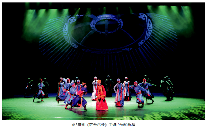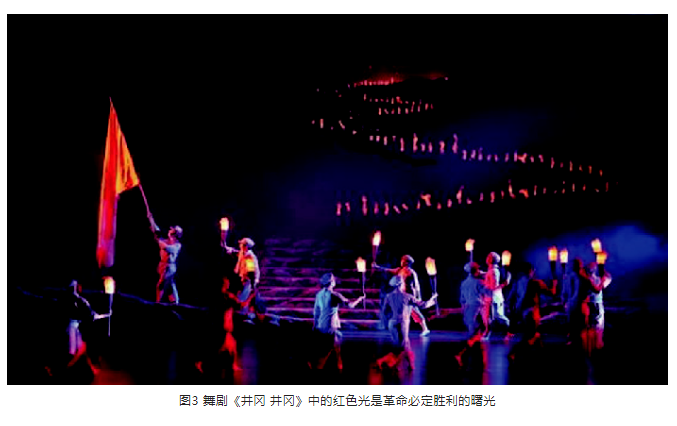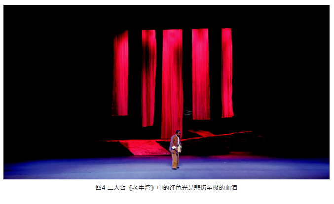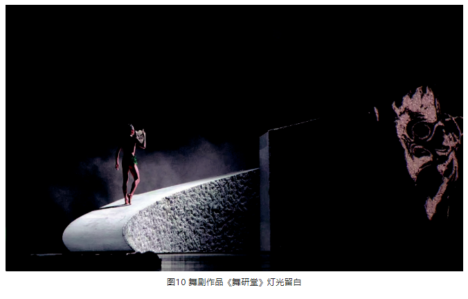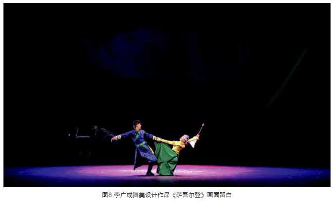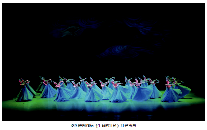 另外,在光位的選擇上,盡量選擇側(cè)光位,側(cè)光位的光束要較逆光弱一些。光區(qū)的邊界在沒有特殊要求的情況下,盡量以柔光斑虛化處理,避免硬光斑的清晰邊界。燈光色調(diào)要與舞美統(tǒng)一,表演空間光比關(guān)系層次分明、把握準(zhǔn)確。特別是景光,在舞美沒有給畫面“留白”的情況下,有的景片可以作無光處理,用不給光來實(shí)現(xiàn)舞臺畫面“留白”,這樣才能保持畫面的完整性。見圖9、圖10。