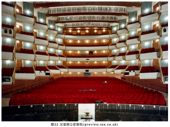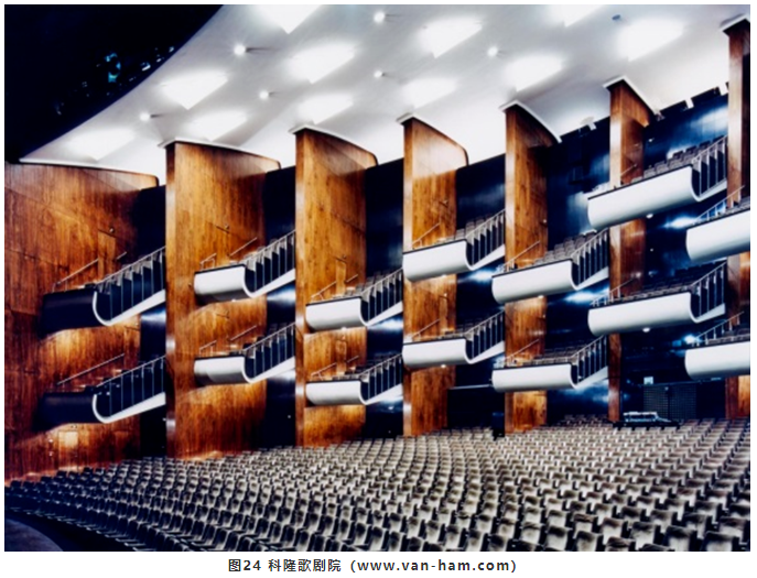 德國歌劇院曾經在20世紀中期,嘗試改進歌劇院側包廂視覺缺陷,將觀眾廳平面設計成六邊形,前半部分擴大(增加容座、為側包廂騰出視角)、后半部分回收(取消邊角不利位置、為后部側包廂內移提供墻體支撐)。側面的挑臺做成一個個略向前傾的雪橇形,層層跌落地朝向舞臺方向。這種“傾斜雪橇”的形式較好地解決了包廂的視線問題,但是觀眾廳前半部分的扇形特性直接導致池座的絕大部分區域缺少早期的側向反射聲。1955年重建的的Hamburg State Opera(漢堡國立歌劇院,見圖21、22)、1957年重建的科隆歌劇院(cologne opera,見圖23)和1961年重建的德國德意志歌劇院(Deutsche Oper,見圖24)都采取了“傾斜雪橇”的形式,但終因聲學上的缺陷而沒有在歐洲和世界上推廣開來。